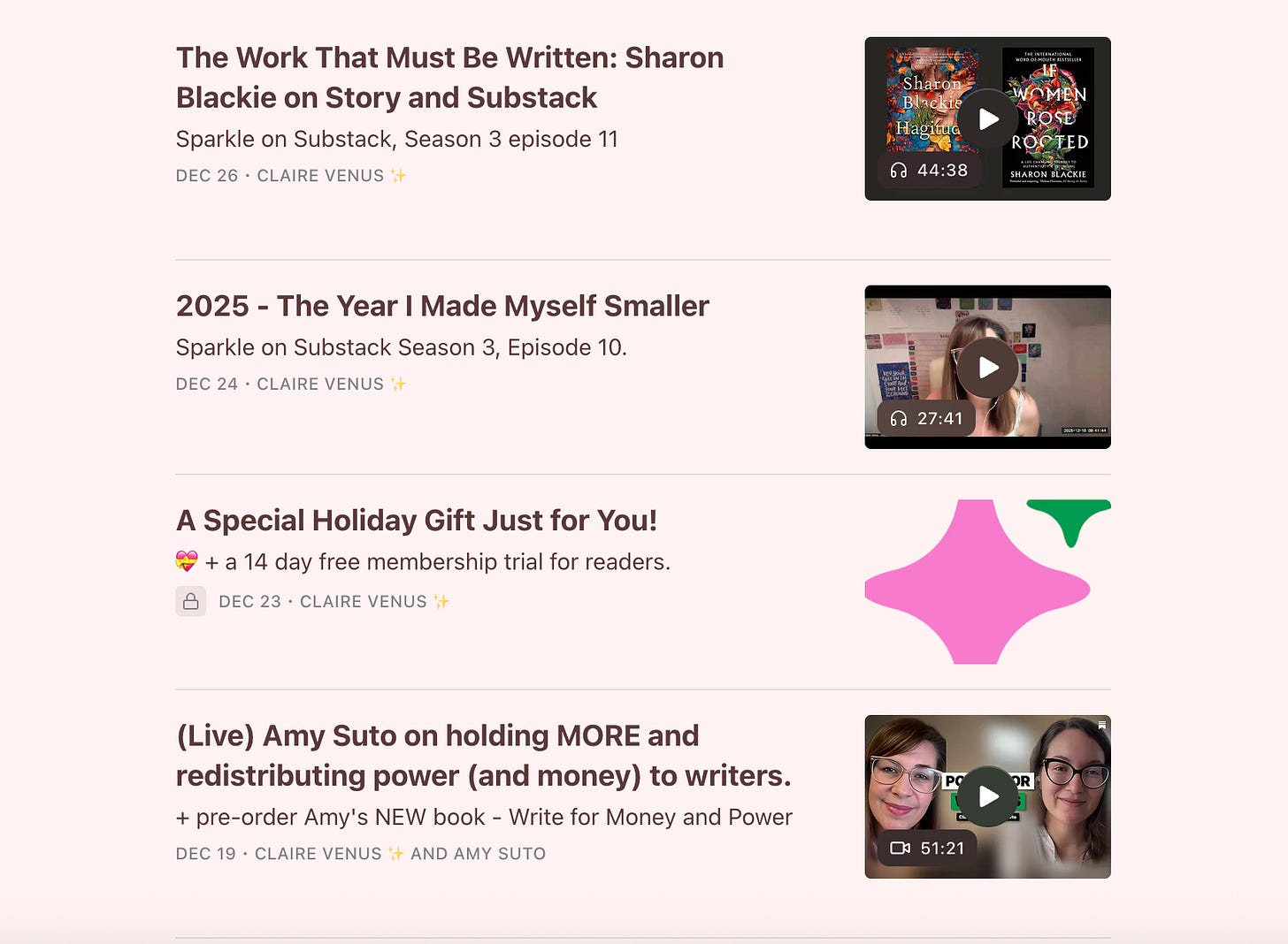 Don’t forget there’s a 14 day free trial for Sparkle on Substack if you’d like to join us over the holidays. The community and membership will re-open on Wednesday 7th January. Before then, you can join Russell Nohelty and I over at January Joy(ful) Growth Club with Russell and Claire for daily joyful growth prompts, challenges and advice!