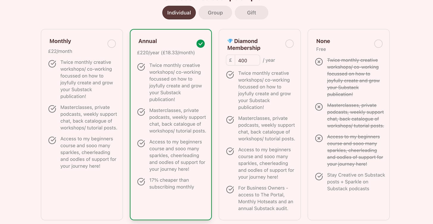 Live Monthly coaching and mentoring calls. (These are either 9.30am or 3pm UK time - I tend to alternate month on month). I hot seat your Substack so we can peer learn together!