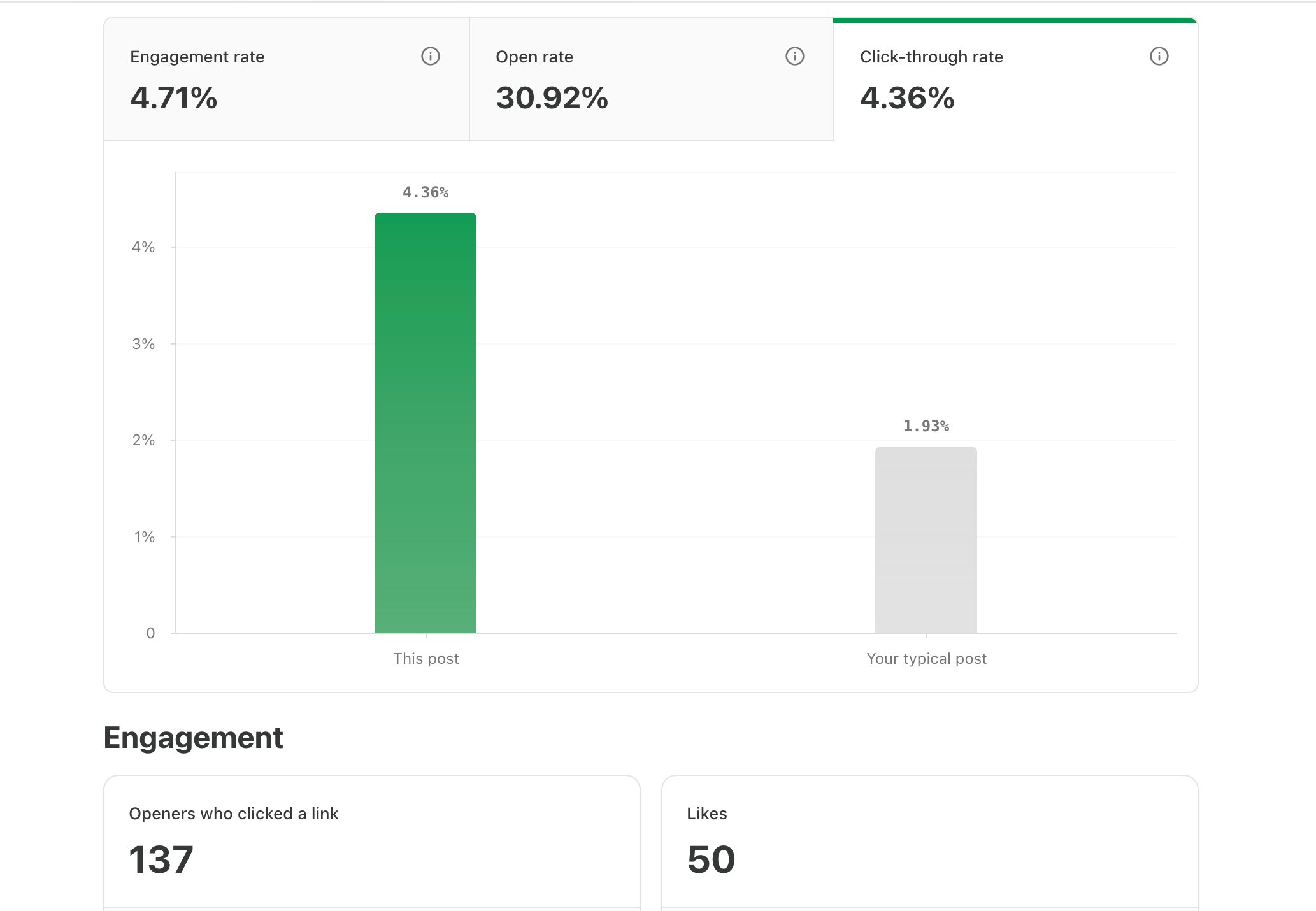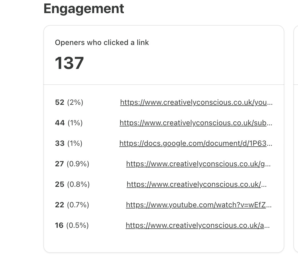 Engagement metrics are my soul food - honestly I love going back over older posts and seeing what broke the fourth wall. Clicks are often silent - not everyone presses the like or restack button. Open rates are cool yes but I tell you what’s ICE COLD - you can quietly see what’s been happening with clicks!