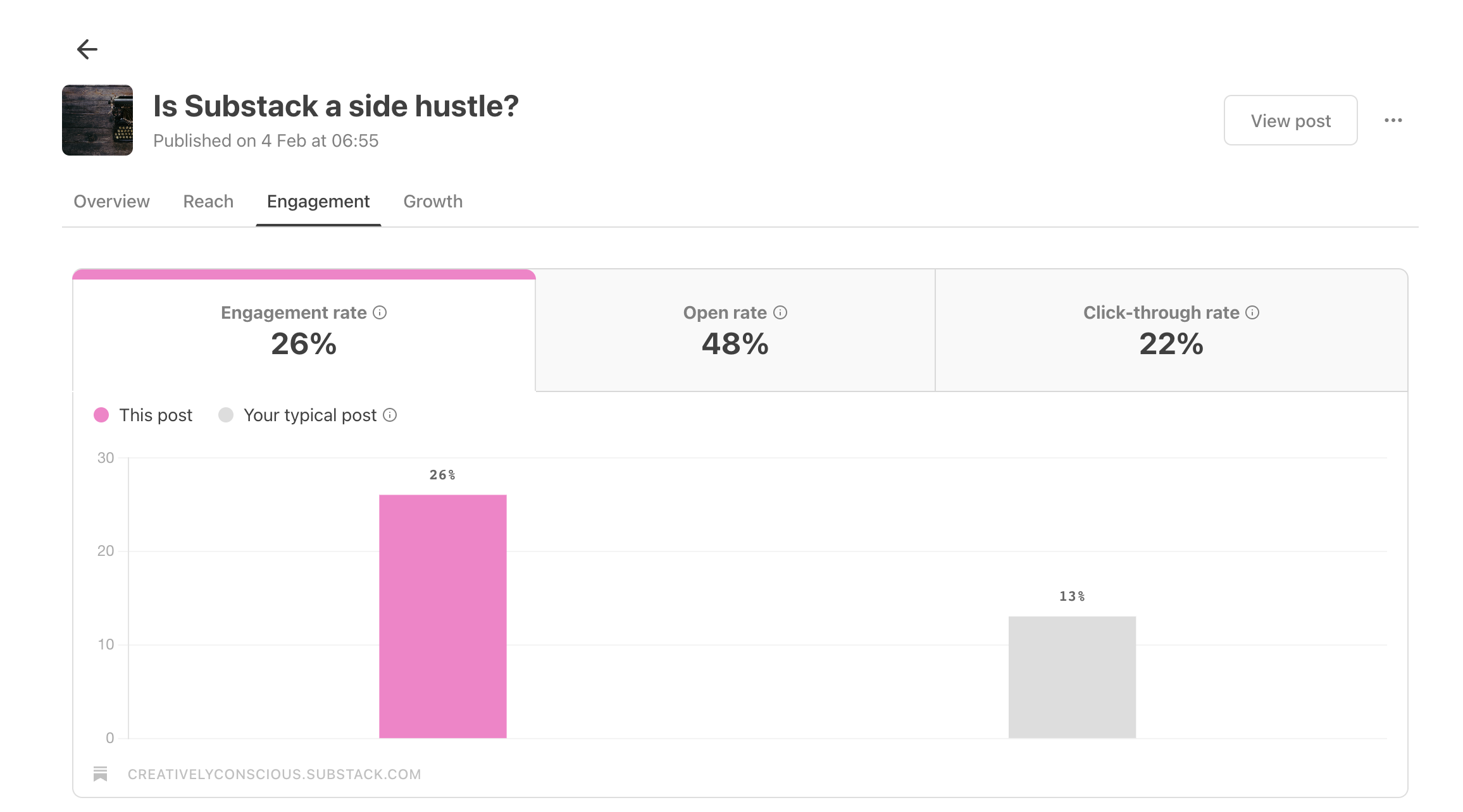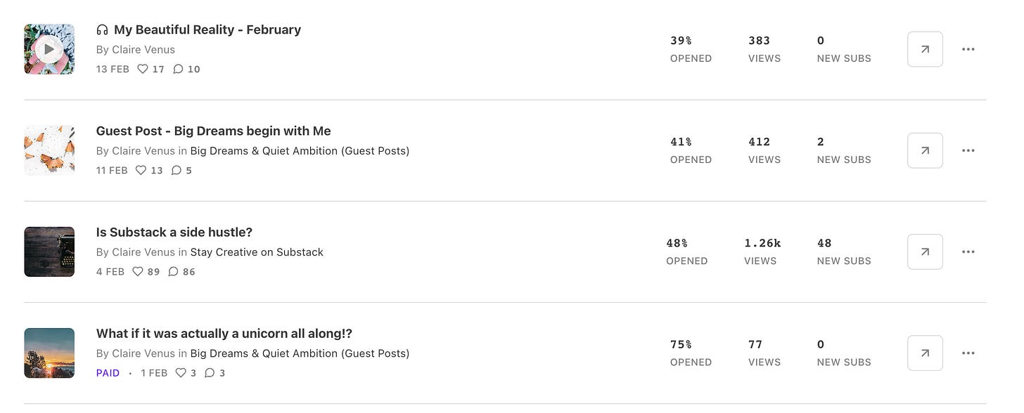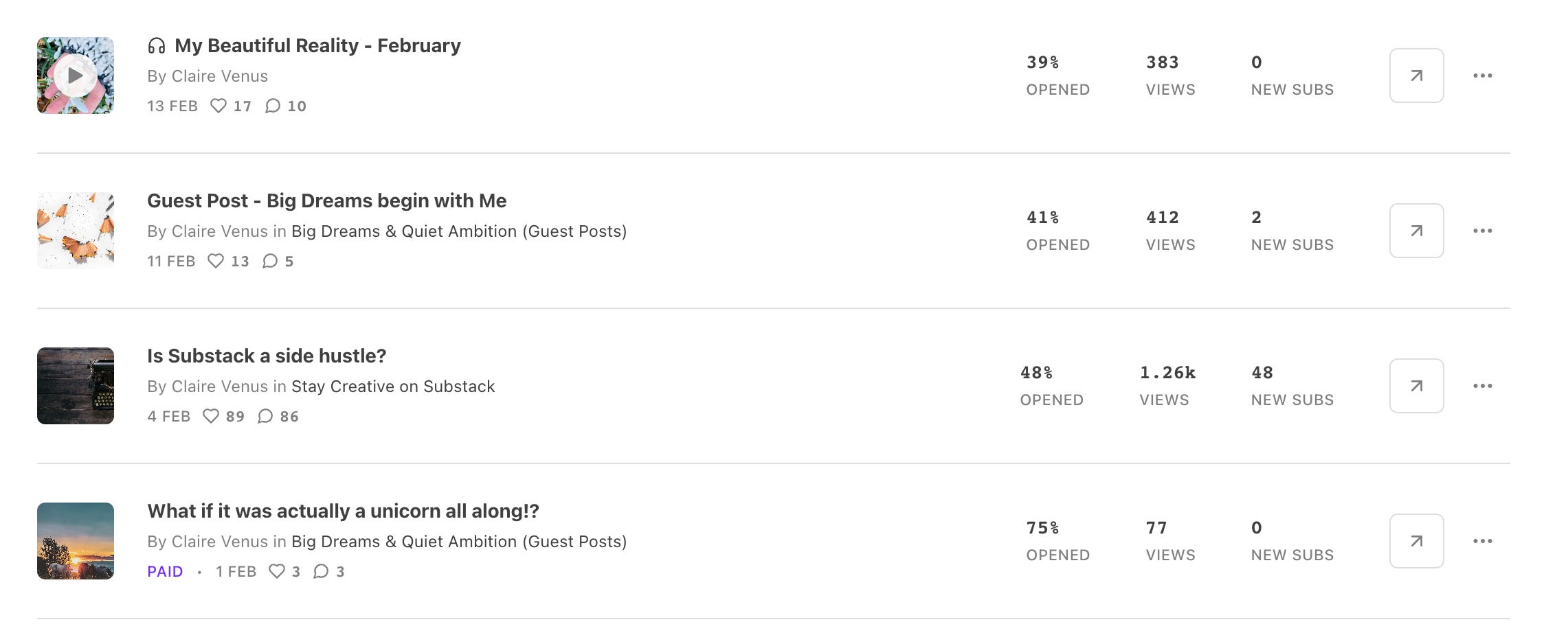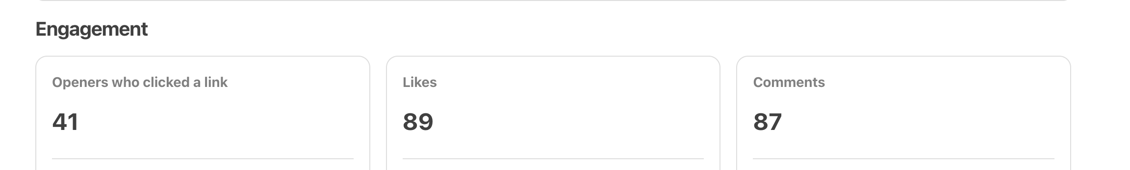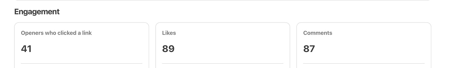 My open rates are around 52% and most popular post has 12 likes. The most comments I’ve had was 8 (I guess half were me 😂) - but I’ve always found that my readers don’t really engage - and when I chat with them IRL they’ve read, resonated and loved everything , quietly by email. And I did migrate 90% of readers from email so it makes sense they’re not getting on the app to engage… yet?!! 🌟
