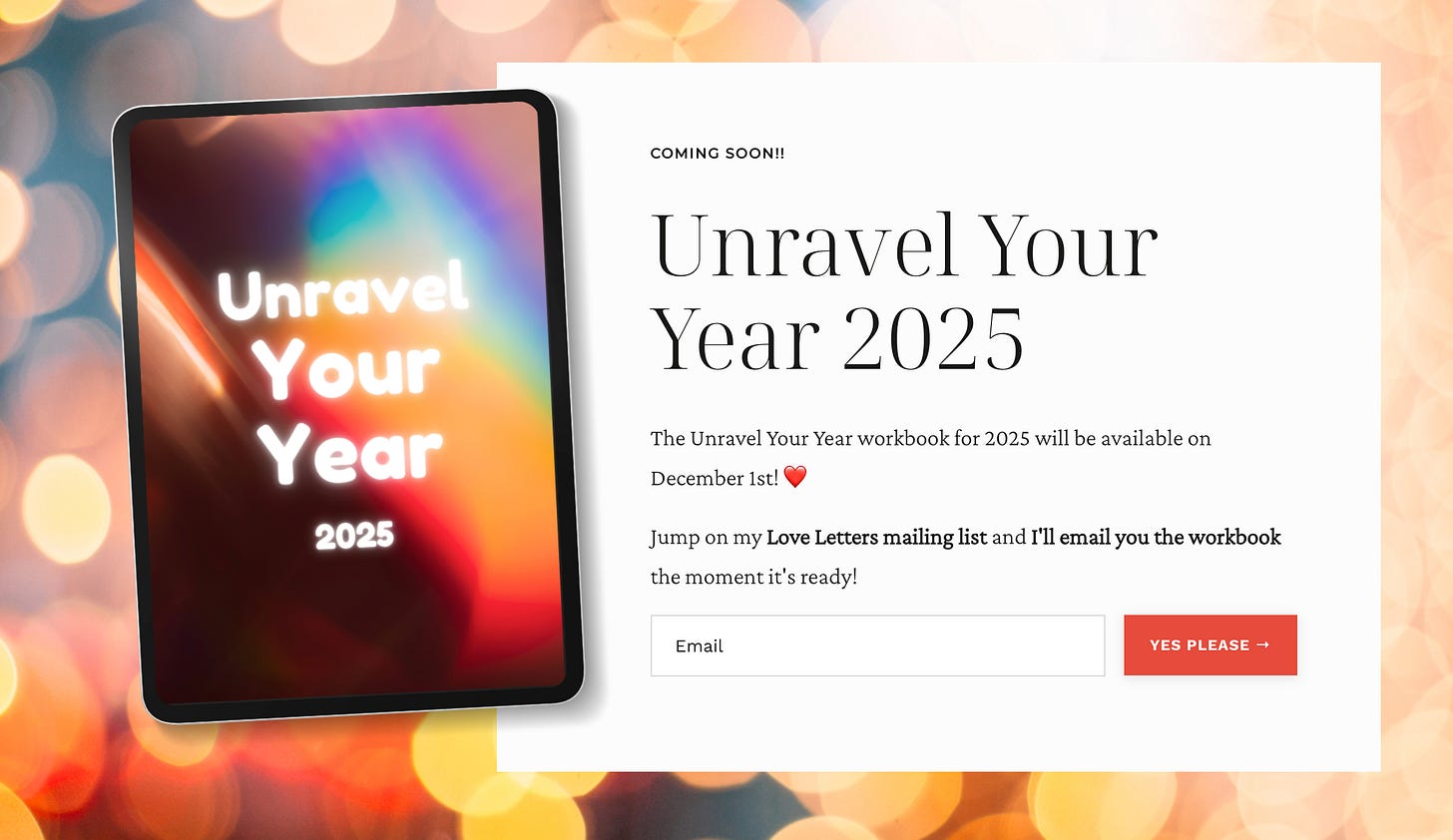 offers a cosy and inspiring community to help you bring more creative joy into your daily life.Grab her free journalling workbook âUnravel your Yearâ and follow along with us - Iâve done this workbook for five years and itâs so helpful and soulful. I canât wait to take part - look out for the accompanying workshops too.